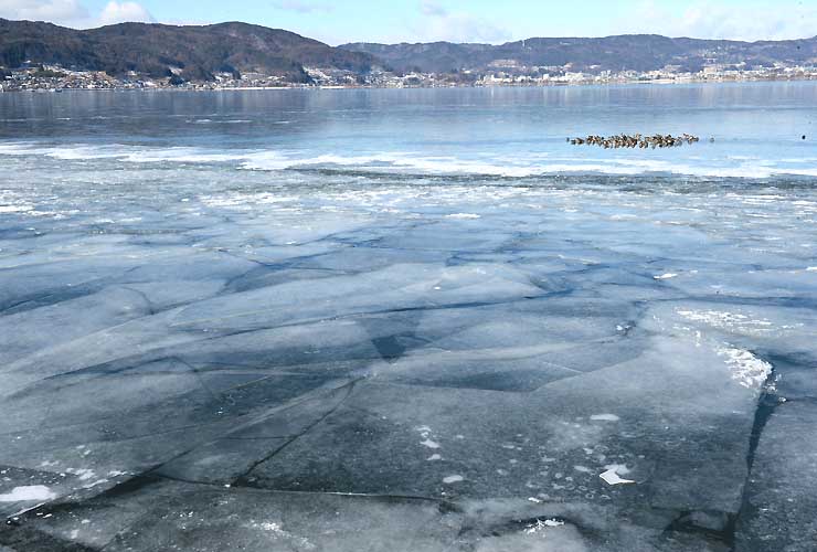 今冬初めて全面結氷した諏訪湖では、諏訪市の上川河口付近から下諏訪町方面、岡谷市湊から諏訪市豊田方面に向かって2本の筋が確認できたそうだ。写真では湖岸側に残った厚い氷に、沖合でできた薄い氷が割れて風で吹き寄せられて白く見えている。湖面の氷が割れてせり上がる「御神渡り」か、と思う人もいたようだが、記録・判定する八剣神社の宮坂清宮司によると別現象だそうだ。氏子はさらなる冷え込みに期待している。