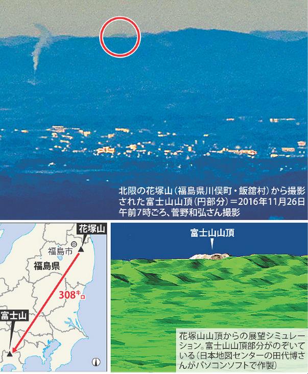 福島県川俣町の登山愛好家が川俣町と飯舘村にまたがる花塚山(919m)で富士山の写真撮影に成功したそうだ。富士山の展望に詳しい日本地図センター常務理事の田代博さんが確認した。富士山からの距離は308kmで理論上は北限とされていたが、写真撮影に成功したのは初めてだそうだ。「花塚山が北限」との理論を証明し、北限の距離を9km更新したが、これまでの北限は二本松市と葛尾村にまたがる日山(1054m)だった。撮影者は唯一残っていた北限の富士が実証されて感無量だと話しているそうです。