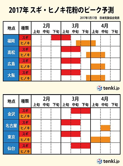 日本気象協会は2017年春の花粉飛散予測第3報を発表しましたね。1月上旬に九州北部や中国・四国・東海地方の一部から花粉シーズンがはじまり、3月には各地で飛散ピークを迎える見込みのようです。