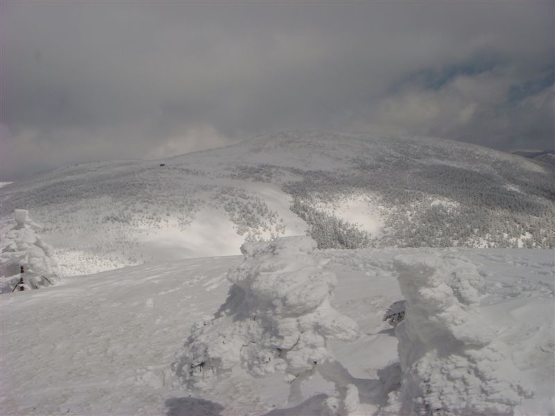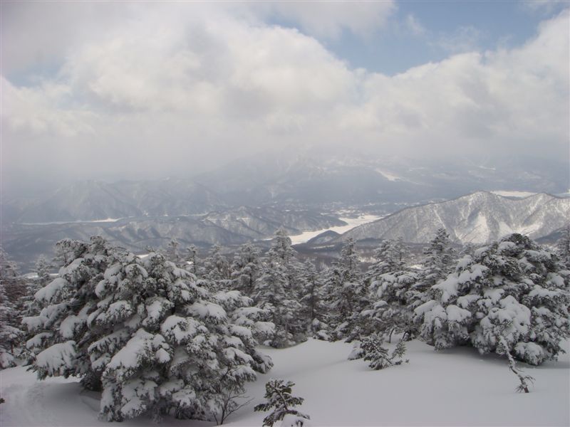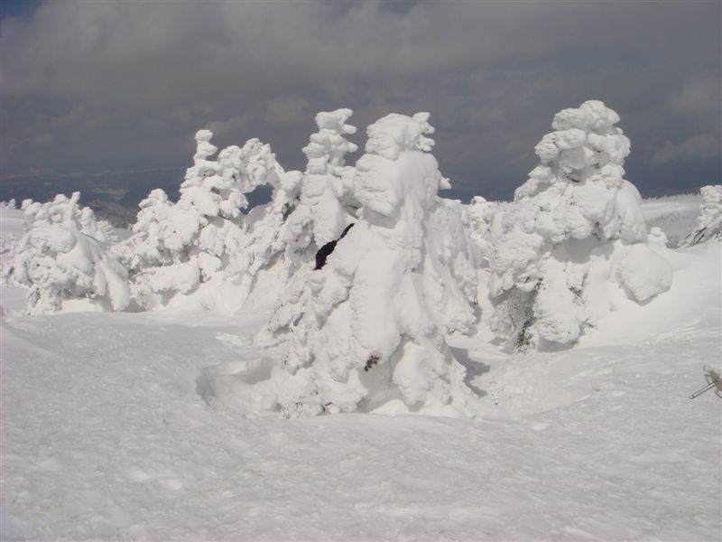 山頂でも天気がよく視界が良い。西大嶺山頂は360度のパノラマが楽しめる絶景ポイントだ。樹氷も見事だ。先週には全く樹氷はなくなっていて雪も黄砂で黄色かったとガイドが説明してくれた。寒風でとても寒いがいい日に来たと思った。