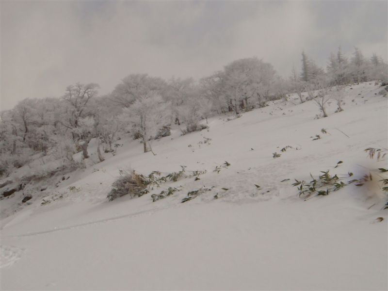 しかし、樹林帯は木が多く、新雪30Cmもちょっと重たい雪なのでスキーで滑るにはとてもきつくターンがうまくいかない。木がない斜面では新雪でターンも出来シュプールが残った。そして、何とか滑りやすそうな木々の間をぬって登山口まで降りてきた。
