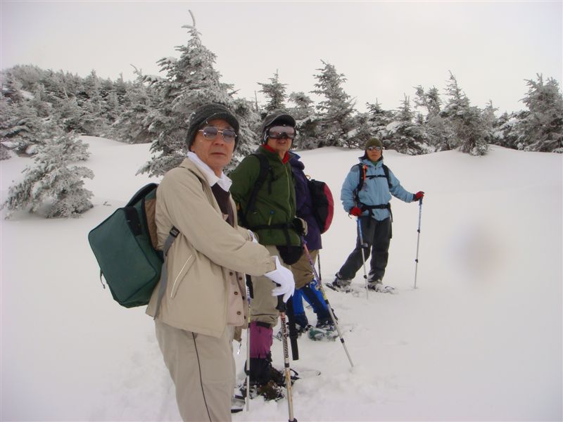 朝起きたら宿周辺でも5~10Cmの新雪である。2日目の28日(土)は朝9:00に猪苗代山岳会の登山ガイドが宿に迎えに来てくれたがまだ雪がちらついている。今日のコースの打ち合わせを行い、自分たちの車は小野川荘に置かせてもらい、磐梯沼尻高原ロッジのハイエース1台でグランデコスキー場へ移動した。ゴンドラ乗り場は混雑し20分待ちだ。ガイドの話ではこんなに込むのは久しぶりだと・・・高速料金¥1,000.-になった効果かも知れない。吹雪のように風雪が強いのでゴンドラで上がってからコースを再度決めることにした。