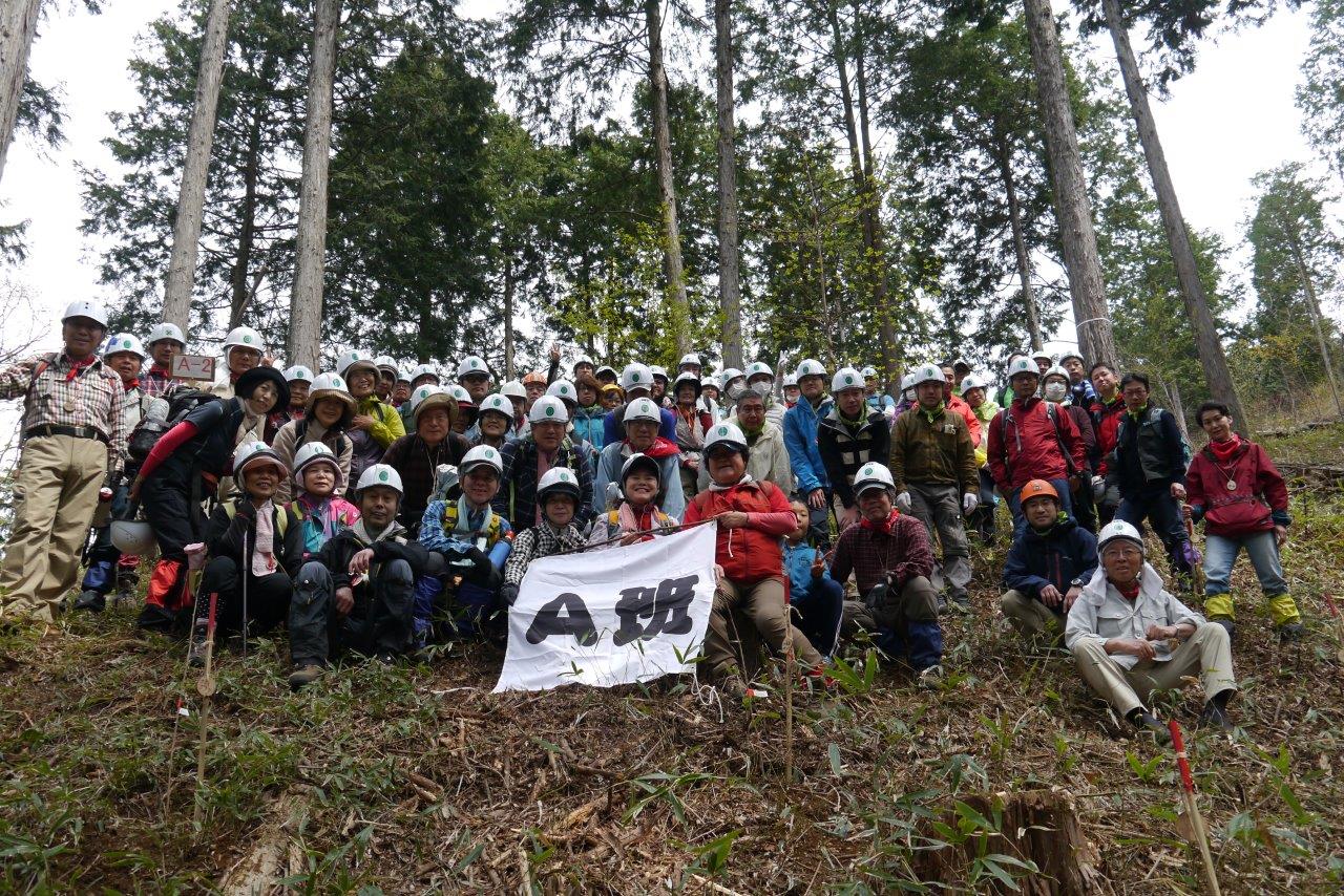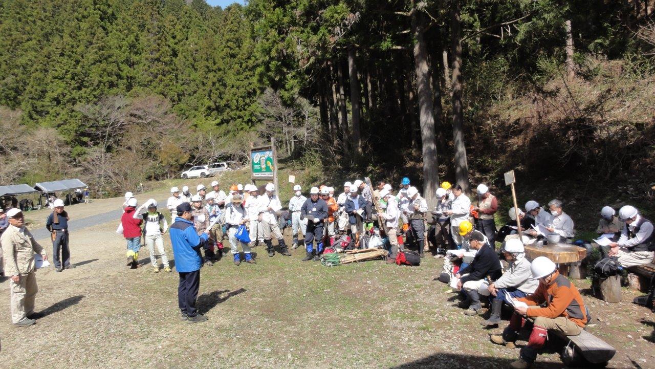 小下沢の作業ベースには受け付けもできており個人会員も出席登録をして参加者を待ちます。大勢の方が集まってきました。今年は約300名の参加者です。主催者代表の挨拶などの後、記念写真も撮りました。