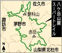 八ケ岳山麓スーパートレイルの整備が始まったと以前書いた(こちら)が構 想を進めてきた茅野商工会議所などが総延長238キロの全ルートを発表した。2007年からルート選定を進めており、トレ イル一帯にある長野、山梨両県(12市町村)の名所や旧跡も訪れることができるようにルートを設定しており、北の蓼科山か ら南の赤岳までの八ケ岳連峰を取り囲むように設定してされている。比較的手軽に登ることができる蓼科山の山頂もルートに含 めたほか、白樺湖畔や車山一帯も通っている。国内にある同様のトレイルの中では最長という。(詳細ルートが載っている八ケ 岳山麓スーパートレイルのホームページはこちら)道標も順次取り付けていきルート一帯の 自然や歴史、伝説などをまとめたガイドブックも作るほか、3月にはスノーシューによる体験ウオークも計画しているようだ。 全コース歩いてみたいですね。