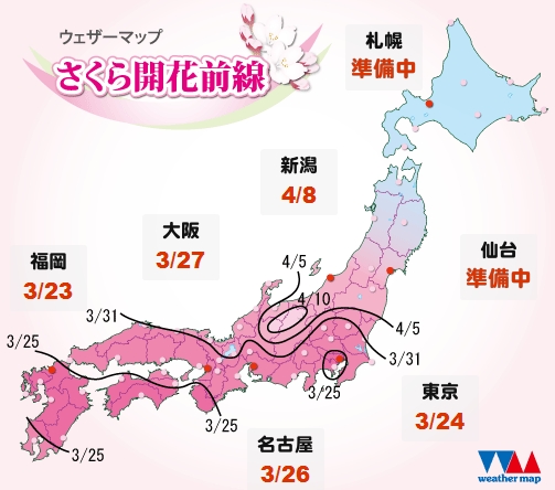 気象庁は1955年から続いた開花予想の中止を昨年決めたが、民間気象会社のウェザーマップは今年第1回の桜の開花予想を発表した。(こちら)開花予想日が最も早いのは福岡市、高知市などの3月23日ごろで、東京都心は同24日ごろと予想している。今年は気象庁が発表をやめたが、民間気象会社はサービスを強化し第1回予想は、既に開花した沖縄・奄美と北海道、東北を除いた、気象庁の標本木がある41地点を対象としたとのこと。各地の予想開花日は▽横浜市3月24日▽広島市、名古屋市同26日▽大阪市、埼玉県熊谷市同27日▽前橋市同29日▽宇都宮市同30日▽水戸市同31日▽新潟市4月8日など。2~3月の気温が平年より高いと予想され、開花日も平年より2~4日ほど早まる所が多い予想のようだ。 気象庁は開花予想をしないが、財団法人日本気象協会は、気象庁が96年からとっている方式とほぼ同じ、コンピューターを用 いた「開花予測方程式」により予想するらしい。今までと予想確度はあまりかわりはないのだろうが民間の方がサポーターと呼 ばれる人からの情報を活用したりするようで的確な予報に成るかもしれませんね。