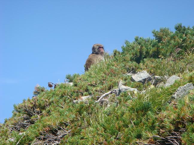 saru.JPG北アルプスの爺ケ岳から鹿島槍へいく間の尾根になんと猿がいた。海抜2600m以上である。熊は里に下り、猿は山の上に行くのだろうか。酷暑だったので涼みにきているのか。この付近はハイマツの樹林帯だが何を食べにきているのだろうか。1匹ではなく数匹で小猿もいた。松ぼっくりだろうか。雷鳥もこの付近には多数生息している。被害はないのだろうか心配になる。食べ残しなど持ち帰らないといけない。2007/8/25撮影