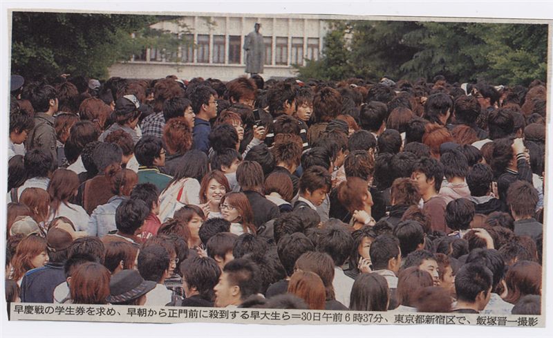 いまどき茶髪は珍しくないけどこの写真を見るとちょっとびっくり。今週末に行われる早慶戦の早大学生席のチケット販売に集まった学生たちだ。ハンケチ王子の人気のようだがそれにしてもこれだけ茶髪だと黒髪の女学生がいないか探してしまいます。