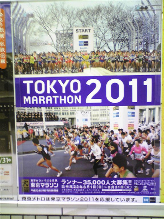 来年で5回目開催となる「東京マラソン2011」のランナー募集が明日8月1日から始まると地下鉄のポスターに出ていた。(公式 HPはこちら)過去4回ことごとく抽選に外れてきたがさて今年は応募するかどうしようかと迷っている。1月に禁煙をして体調はなかなか良い のだが長距離を走る練習はあまりしていない。抽選に当たってからでも(10月中旬抽選結果発表・通知)なんとか練習は間に合 うだろう。募集期間は平成22年8月1日~8月31日なのでゆっくり考えることにしよう。