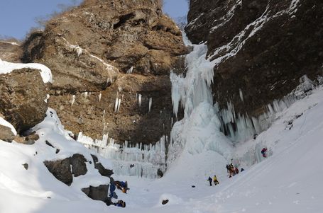 そこで日光署員と市遭難対策協議会員ら約30人が救助訓練を行ったそうだ。同渓谷は日光市中心部から約8kmの稲荷川上流・女峰山の中腹で標高は1400mあり自然が作り出す雪と氷の造形美で知られている。今年は久しぶりに太く成長した氷柱が並ぶ場所もできて、見応えがあるそうだ。救助訓練はベテランの山岳救助隊員の指導でこの自然の芸術品に立ち向かい登攀や懸垂下降などの訓練に取り組んだようだが景色も訓練も見ごたえありますね。