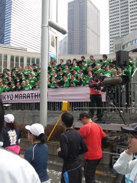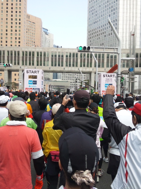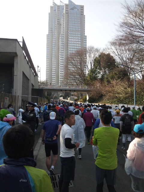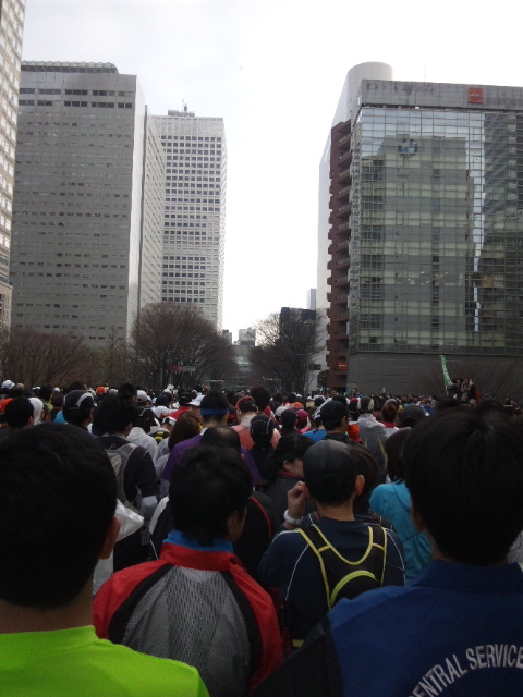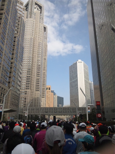 朝7:00前に自宅を出発し都庁の集合場所へと出かけた。集合場所の仮設トイレは混むとの情報から周辺のビルのトイレが開放されているので利用した。並ばず暖かい場所で助かりました。ここで着替えをしている人もいました。受付ゲートを入り荷物を預け私の出発ブロックKの公園へ行きスタートまで40分ほど待機です。日差しがありウィンドブレーカも着ないでスタートを待ち、花火が9:10に上がりスタートしたようです。