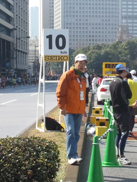 皇居前広場あたりから10Kmとフルマラソンのコースが区切られていました。私はフルマラソンコースへ移動して10Km通過です。37分05秒で出し快調です。アクシデントが無い限り完走できると確信しましたがまだ32kmもあると思うと気がめいりましたが沿道の応援でファイトが出てきます。