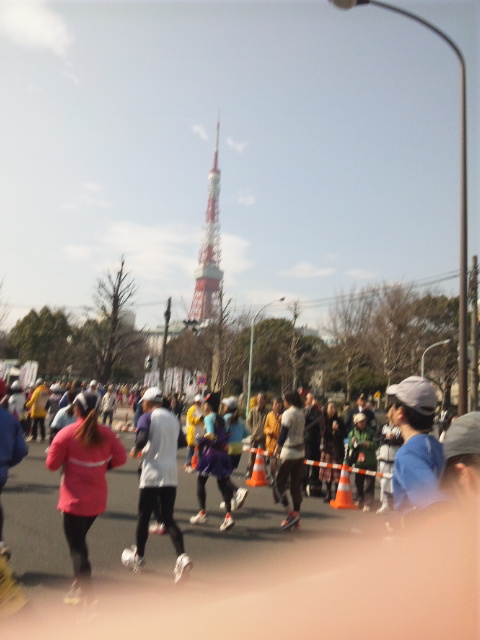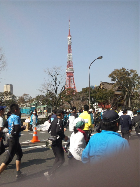 御成門を通過し東京タワーが見えてきました。気温が高くなってきましたが暑さは感じません。とても気持ちのよい走りが出来ます。数km毎の給水で汗かきの私はこまめに水分を補給します。ボランテラの方々に感謝です。沿道の個人サポーターもチョコやお菓子や飴などを配っています。感激しました。