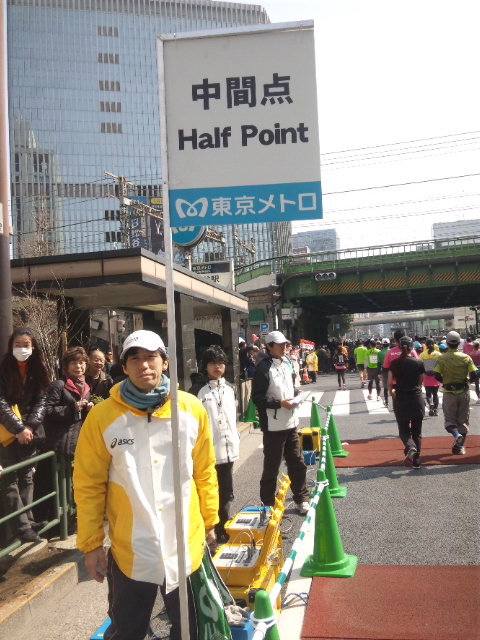 ゴールはまだまだと思いつつも中間点の銀座に来ました。お腹も少しすいてきましたので栄養補給のジェルをチュ~チュ~と飲みました。あと数キロ行けば特製バナナなどのサービスが待っています。携帯電話が鳴り出しました。山友からいいペースだ、がんばれメールが。そして女房や孫たちから思ったよりペースが速い(失礼ですよね!)ので早めに家をでて沿道で応援するとの電話がありガンバガンバで先を進みました。