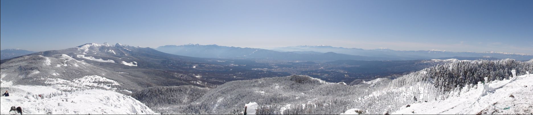 すばらしいパノラマです。八ヶ岳から南、中央アルプス、御嶽山、乗鞍岳~北アルプスまでよく見えました。