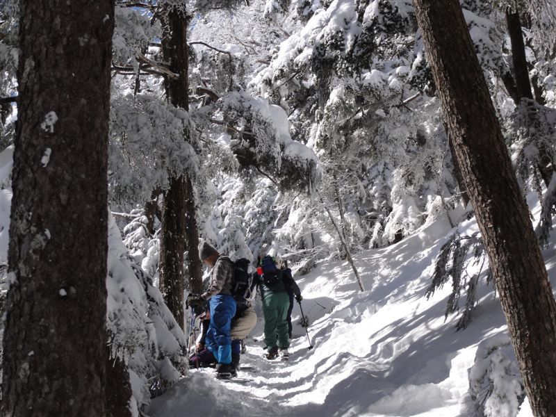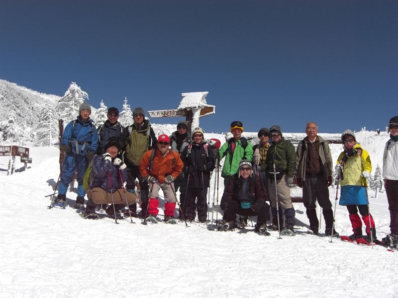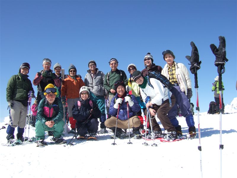 そしてスノーシューを装着し全員で記念撮影です。ストックの上に小型三脚をセットしセルフタイマーで撮りましたが撮影者がちょっと半分欠けてしまってますね。