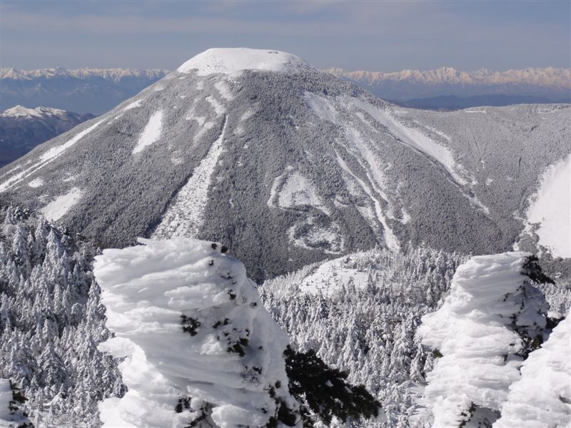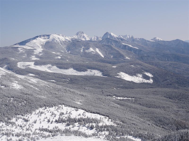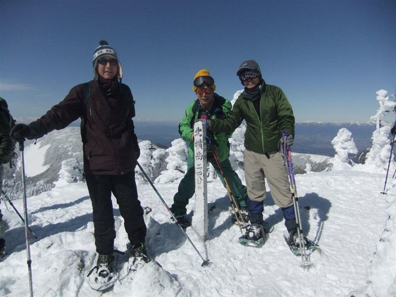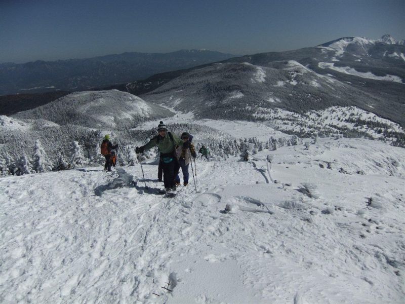 最後に八ヶ岳の全景です。いつまでも見ていたいのですがそろそろ下山します。私たちはスノーシューで上りましたがアイゼンの方たちも多いですね。この山はふぶかなければ安全な冬山初心者コースなので人気があるようです。