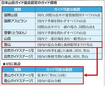 大雪山系のトムラウシ山でツアー登山客ら8人が凍死した遭難(大雪山系トムラウシ山(2141mで2009年7月16日ツアー登山客15人、ガイ ド3人一行が遭難し中高年の客7人とガイド1人が凍死した)の教訓から、山岳ガイドの協会が夏山登山専門のガイド資格を新設している。 ツアーを率いる旅行会社の添乗員らに山の知識を深めてもらい、悲劇を繰り返さないためだとしているがツアーの安全性はどうなんだろう 。中高年のツアー登山人気が高まり、経験や知識をもつ添乗員やガイドの需要が増す一方でこのハードルの高さが資格の取得を阻んできた 。ガイドの質向上を目的に2004年に資格制度をつくり(写真)認定資格を7種類設けたが旅行会社が企画するツアー登山の添乗員やガイド には「登山」程度の知識や技術が必要との目安だった。法的な決まりもなく、トムラウシ山では遭難したガイド3人のうち人は資格をもっ ていなかった。山岳ガイドの協会ではは「山での力を兼ね備えた添乗員らが足りない状況を、資格をとりやすくすることで改善したい」と 話すしているがハードル下げ取得しやすくなったガイドで大丈夫だろうか。実力のあるガイドが添乗しているか見極めるのは難しいですね 。私はツアー登山は怖くて行きませんが・・・