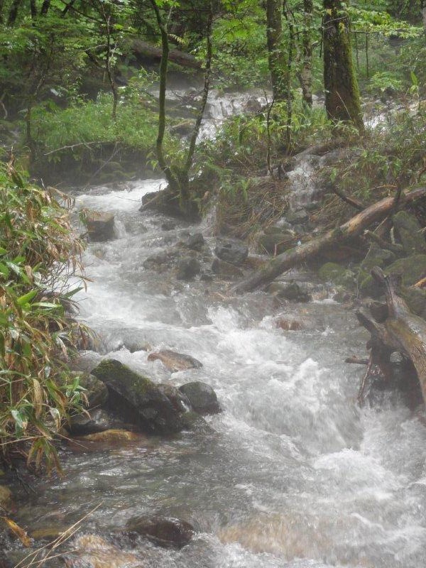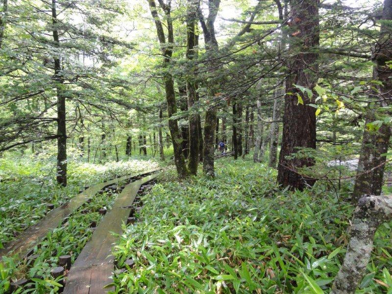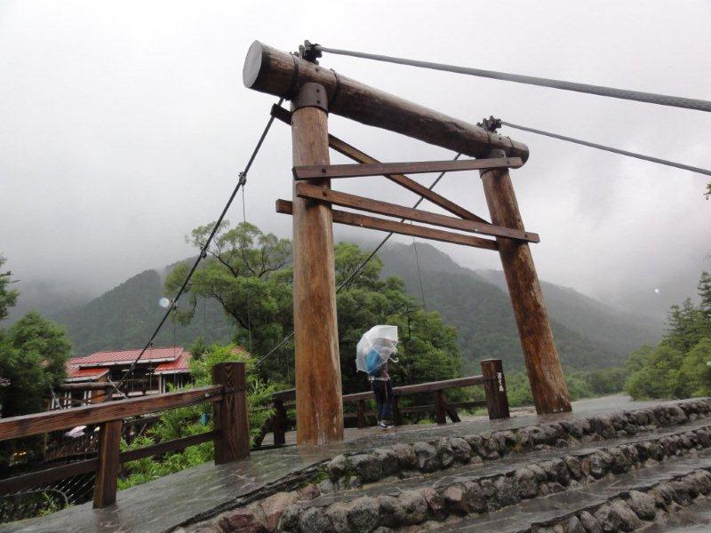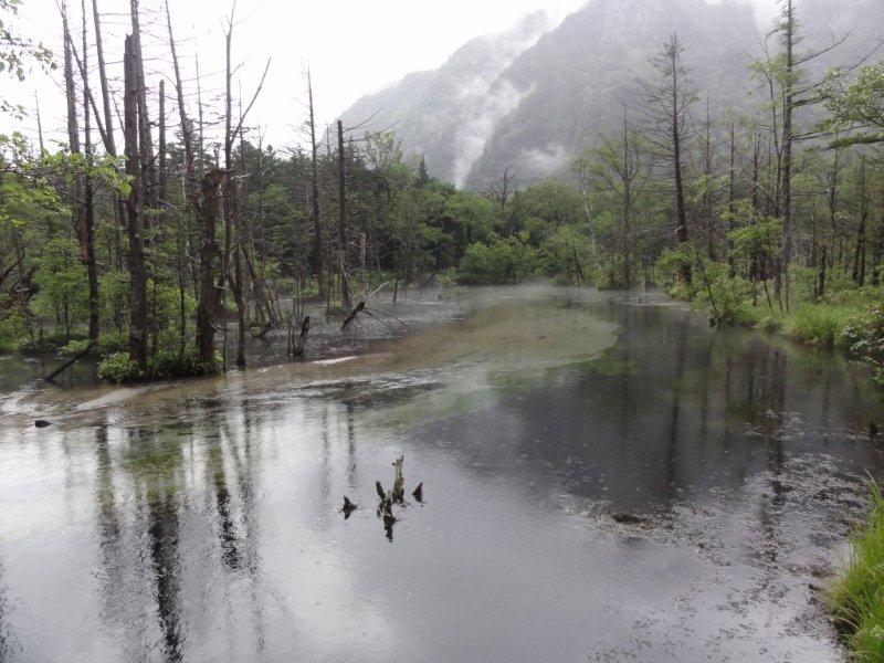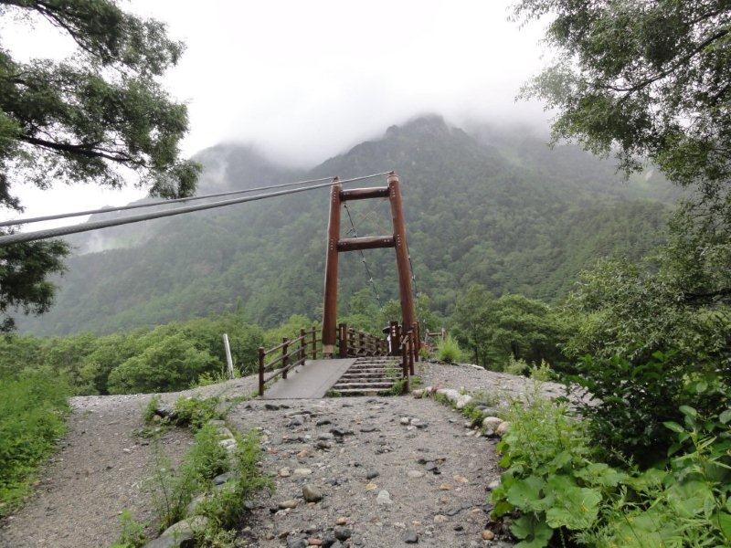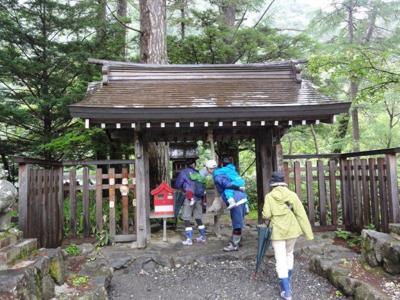 晴れていれば左岸からは明神岳を見ながら明神へいけるのですが雲に隠れていて残念です。でも雨に洗われた緑の森の中も素敵です。雨合羽、傘、長靴でのトレッキングも問題なしです。2歳の孫は500mくらい歩いたら疲れたのかおんぶです。おんぶ紐でお母さんの背中にゆられていきますが途中で念ねしてました。5歳の孫は元気に明神橋まで歩き約3.5kmほどある明神池の穂高神社までがんばってくれました。