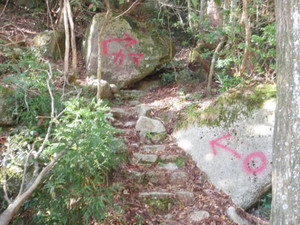 びっくりしました。三重県菰野町の鎌ケ岳(11161m)で、未整備の尾根道につながる案内が無断で岩などに書かれ(写真)、登山客が 道に迷う遭難事故があったとニュース出でていた。尾根道は眺望が良く、登山上級者が利用するケースもあるが善意かもしれないが、危 ない所もあるので無断で標識は付けないで」と呼び掛けていると。今月上旬、名古屋市と津市の30代女性二人が下山中に通常の登山道へ 行く分岐近くで、立木にマジックでかかれた案内に従ったところ、尾根道に迷い込んでしまったそうだ。遭難事故を受け尾根道の出入り 口に無断で書かれた4個の案内を消し、「安易に踏み込まないで」との注意書きを出入り口に一個ずつ設置したそうだ。ほかの山ではこ んなことはないでしょうね。とても危険な行為に怒りを感じます。