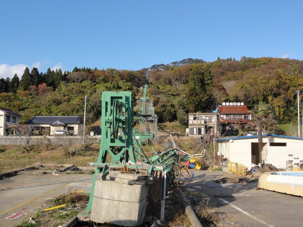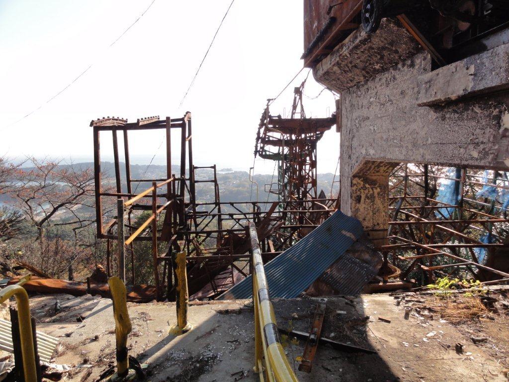 気仙沼大島の亀山を見ながらフェリーで入港する浦の浜を下船すると日本最古のリフトがあった。しかし大津波で破壊された貯蔵タンクから流出した重油や軽油、ガソリンが海の上で燃えその飛び火で大島の亀山も一部燃えた。観光施設で大きな被害はこの亀山に登るのに便利だった浦の浜から頂上までのリフトの被害であった。