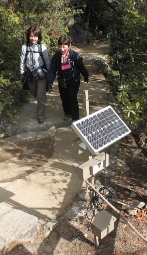 平清盛の大河ドラマで観光客が増えている宮島の弥山に登山者カウンターを設置したそうだ。弥山北側の山腹は瀬戸内海国立公園の特別保護地区となっていて今後 の自然保護の基礎データとして公園管理に活用するそうだ。カウンターは人が通過すると赤外線センサーが感知し、登山、下山の人数をそれぞれ記録し太陽光発電 パネルとバッテリーで省エネによる常時監視をしている。登山道の紅葉谷コースと、宮島ロープウエー獅子岩駅からの登山道の合流地点の近くと、大聖院、大元の 両コースが交わる仁王門跡近くの計2カ所に設けている。ここ数年、弥山の登山者数は増加してようだが登山時の届け出が不要なため正確な人数は把握できていな いためコース別の登山者数を調べ、特別保護地区の自然保護に生かすそうだ。しっかりしたデータでの自然保護のための規制は説得力もありいいことですね。 【写真は中国新聞を借用】環境省広島事務所が弥山登山道沿いに設置した登山者カウンター