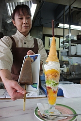 新メニューは、ツリーの形をイメージした高さ約40Cmのツリーパフェで桃やキウイなどの果物やアイスの上にコ ーンを逆さに載せ、その上に細長いチョコ菓子を立てものでツリーを意識して値段も634円。
