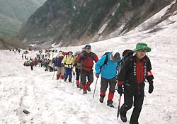 日本三大雪渓の一つ、北アルプス針ノ木岳(2821m)の針ノ木雪渓で6月3日に第55回針ノ木岳慎太郎祭がおこなわれたと報道されてい た。大町市を拠点に日本初の登山ガイド組合をつくった百瀬慎太郎(1892〜1949年)の功績をたたえる行事である。自然への畏敬の念 を忘れずに毎年祭典をおこなっているそうだが残雪を踏み締め、濃い緑から芽吹きへと、高度を上げるにつれ初夏から春に戻っていく 雪渓の涼味を満喫できてすばらしいですね。 参考:信州山小屋ネット