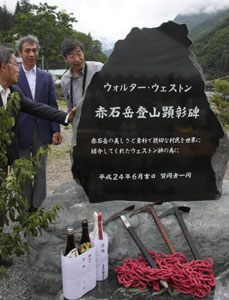 写真はウェストン氏と大鹿村の縁を伝えようと建てられた顕彰碑です。2012/6/8に南ア大鹿登山口にウェストン碑の除幕式がおこなわ れると書いた(こちらの日記)が除幕式の写真が掲載されていた。 ウェストン氏は1982(明治25)年8月に大鹿村から南アルプス赤石岳を登頂したが登山の際に訪れた宿の丁寧なもてなしに感動して著 書の中で「日本の最深部で真の紳士を見た」と同村を紹介したのだそうだ。村とウェストン氏との縁を将来に伝えようと大河原地区の 新小渋橋の側に、小渋川で採ったかんらん岩と緑色岩で高さ約107mの顕彰碑を建立し「赤石岳の美しさと素朴で親切な住民を世界に紹 介してくれたウェストン師の為に」の文が刻まれている。ウェストン碑は大鹿村で6箇所目のようですね。