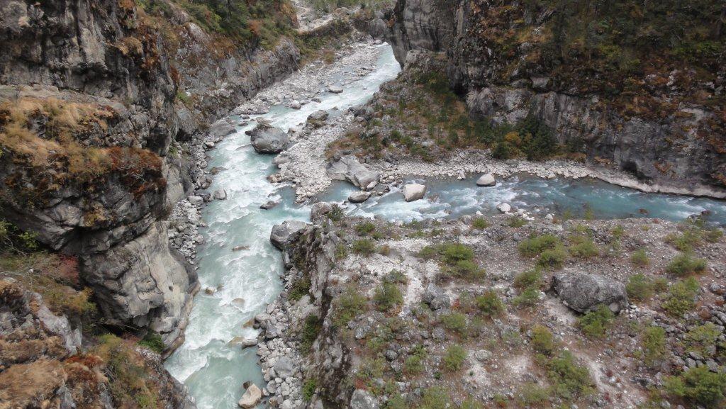 トレッキング2日目11月10日はパグディン2610mからナムチェ3440mまで約6時間の歩行です。吊橋を数回渡り国立公園チェックポストのあるジョサレへ向かいます。標高差600mの急な登りつづら折の道をゆっくり登りきってナムチェ村に入ります。