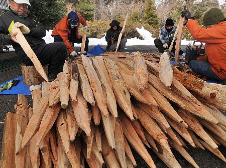 箱根町元箱根の県自然環境保全センター箱根出張所では春の登山シーズンに向けて杭作りが進めているそうだ。箱根近辺の 登山道の補修や土留めに使用する杭をボランティアが製作しているのだ。2007年度から始め、登山道周辺の枝の切り落とし なども含めて月3回実施している。長さ約80cm、太さ5cm程度に割られたスギやヒノキの間伐材を、参加者は丁寧になたで先 端をとがらせ形を整えて作っている。冬場は地面が凍結しているために登山道での杭を使った補修整備は4月から始まるそう だが登山やハイキングに助かりますね。