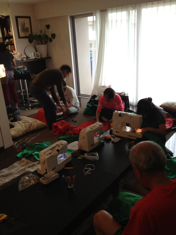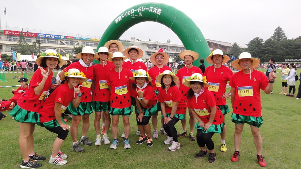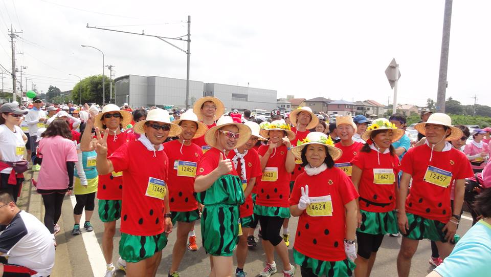 6月23日千葉県の富里市で行われた富里スイカマラソンをランニング仲間14人で走ってきた。この大会は抽選でグループエントリーは4人ず つの単位で行ったのだが全員当選し走ることが出来た。この時期暑いので全員楽しんで走ろうとのことで仮装で走ることとし、ラン仲間の 奥様のアイデアとご指導により有志で14着の衣装を手作りで作成した。私の出来ることはパンツやスカートのゴムひも入れくらいだが出来 ることを協力し合っての力作です。