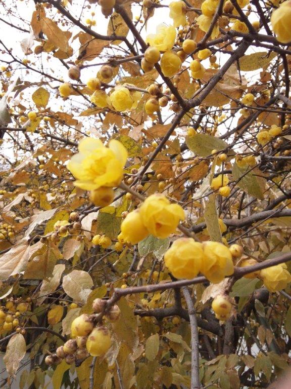 境内の中には蝋梅が咲いていましたが葉が落ちずに花が咲いていてなんとも奇妙な感じでした。