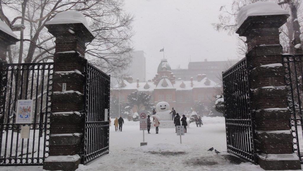 中には入りませんでしたがもんから雪に煙る赤レンガがいかにも北海道らしい景色でした。