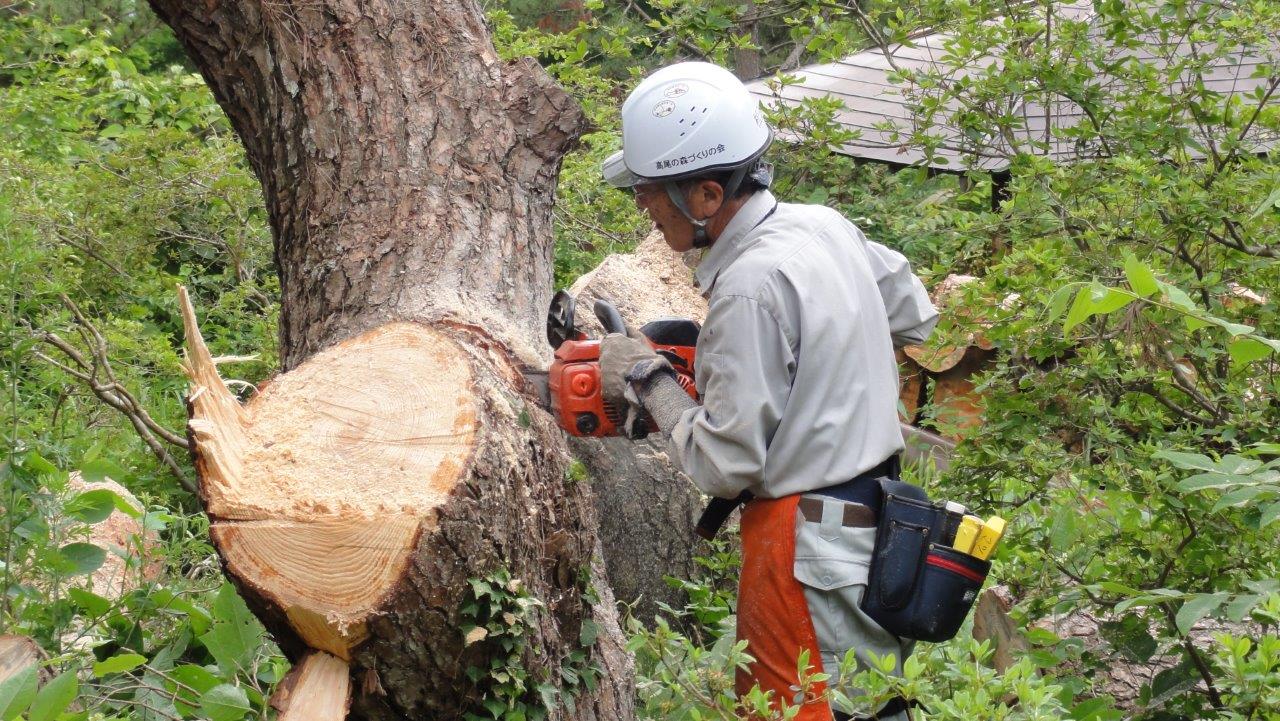 松くい虫にやられて枯れてしまった松の大木の伐採です。
