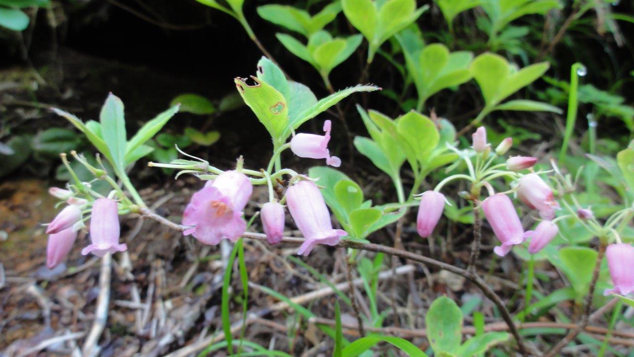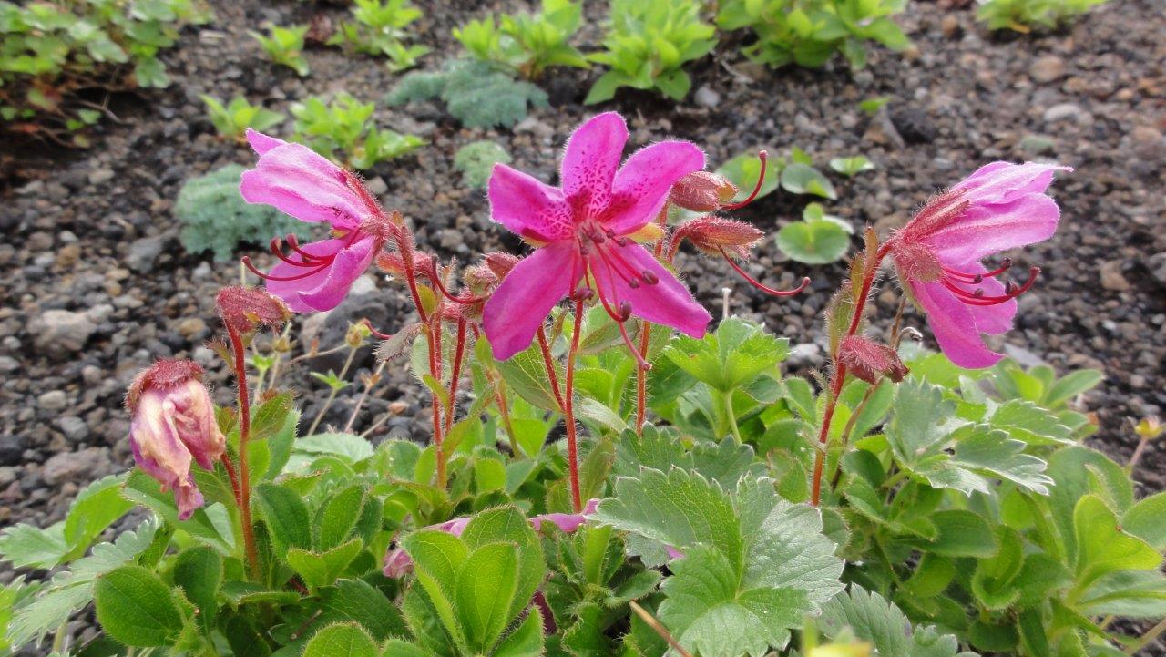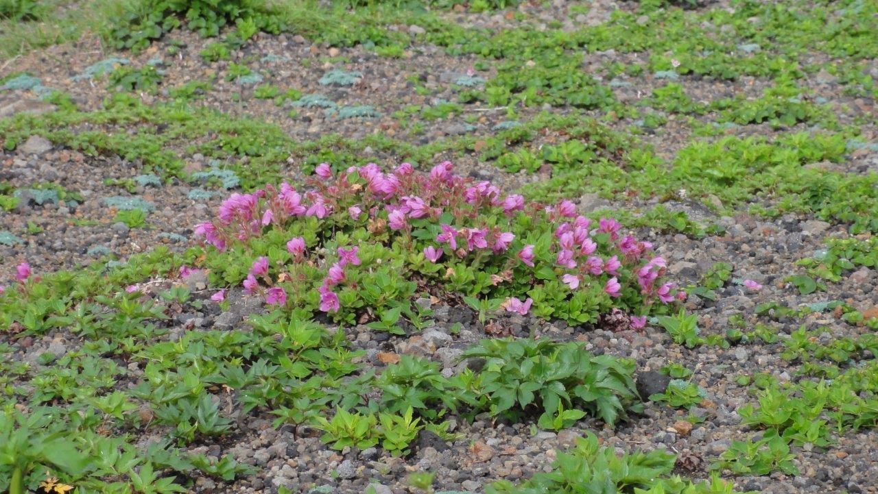 ムーミン谷へ降りていく分岐からはガレ場になります。ここにはチシマツツジの群生があります。綺麗ですね。