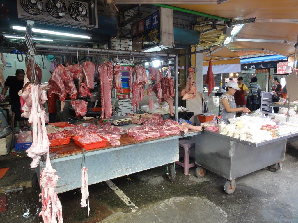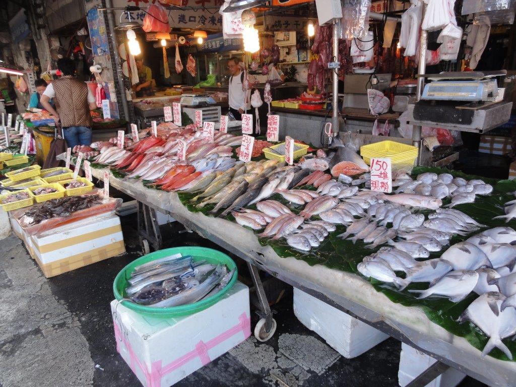 大勢の人と、野菜、果物、魚介、肉のお店が一杯ありました。