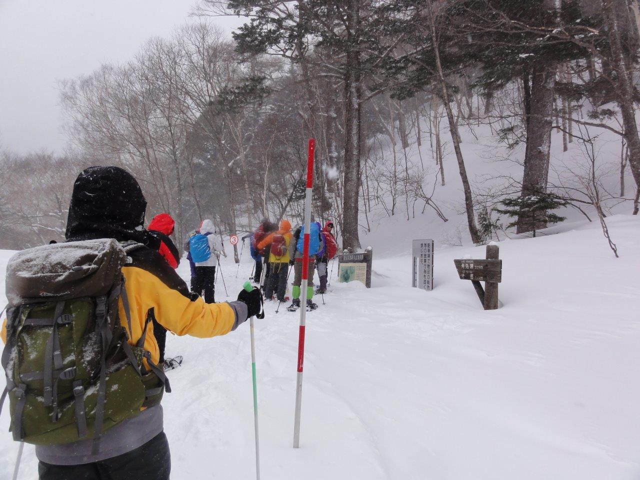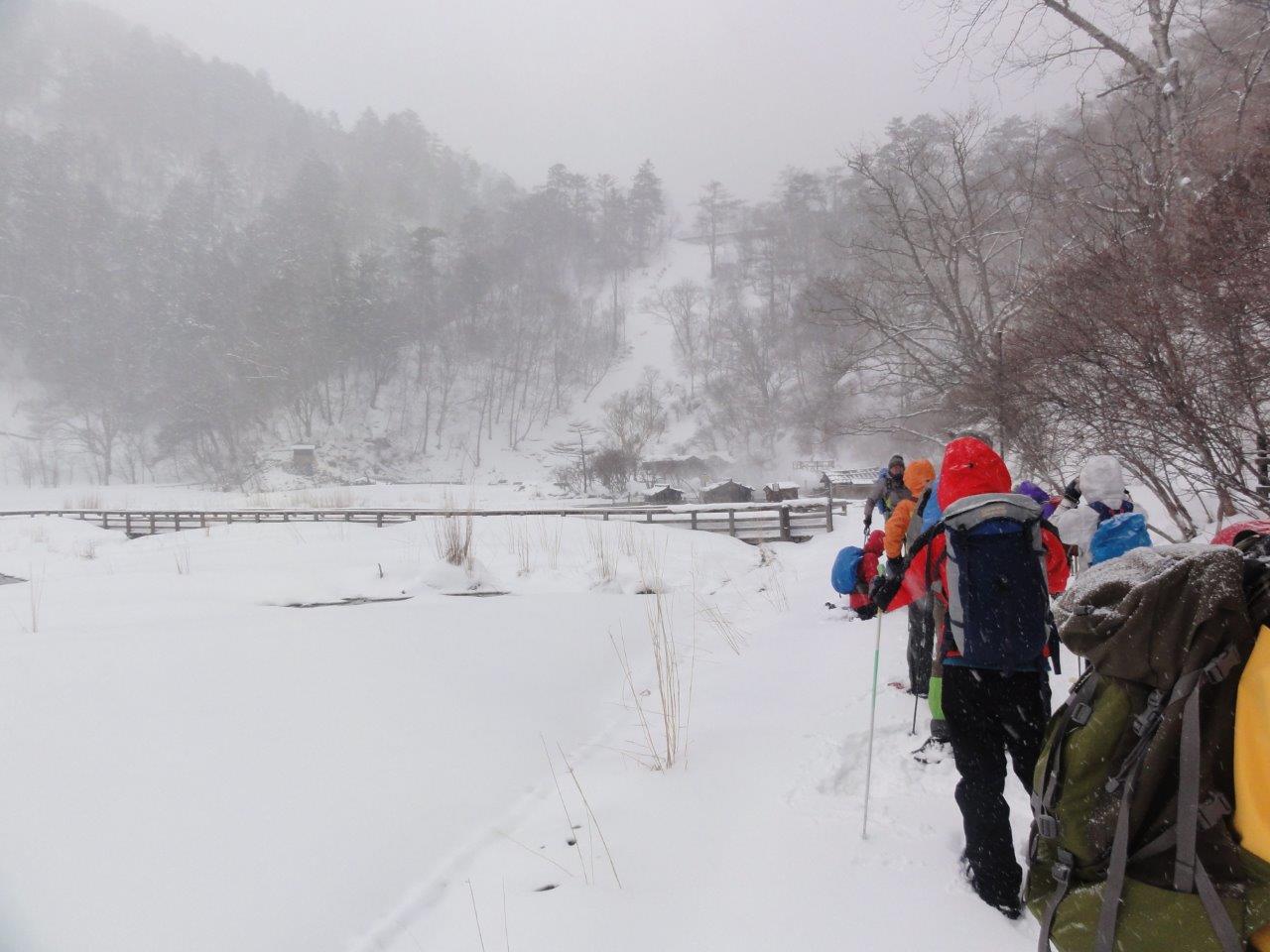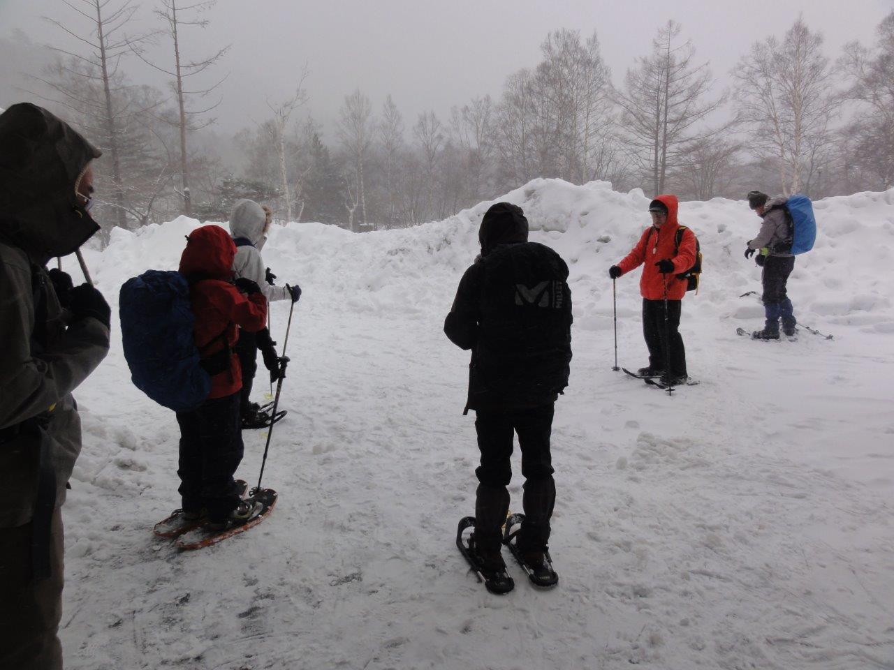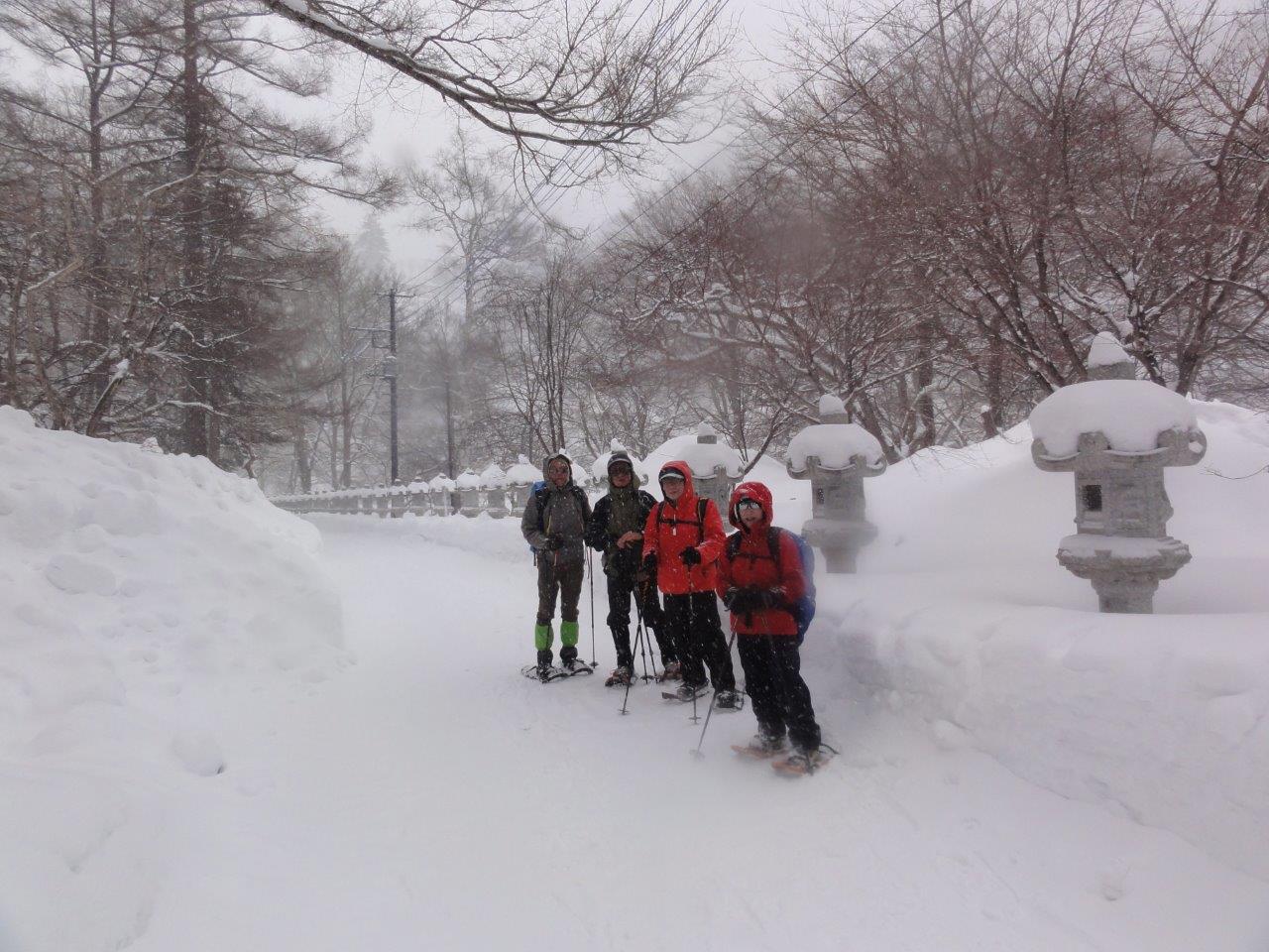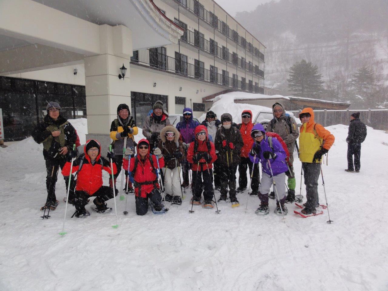 出発前の集合写真です。雪が沢山降ってきていますが皆さんやる気です。