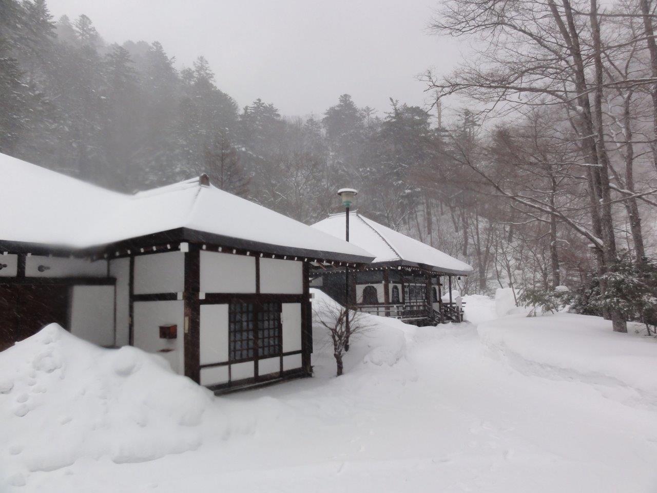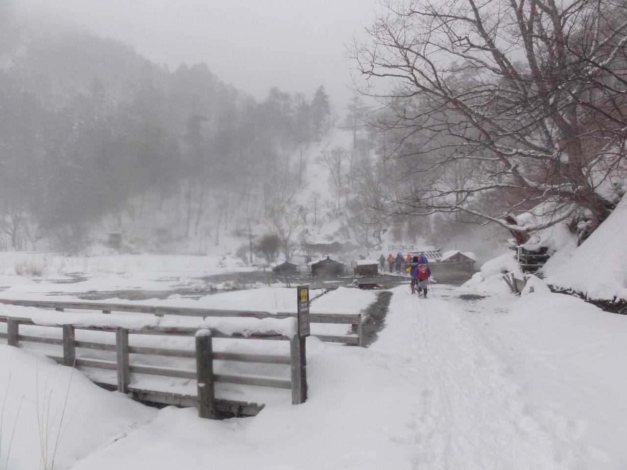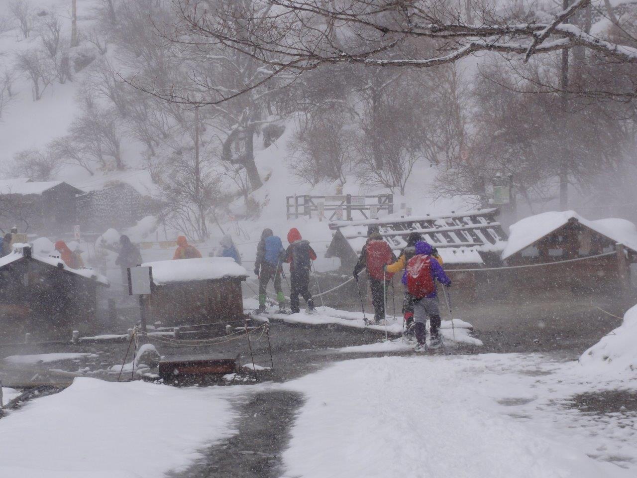 3月1日目を覚ますと雪がちらちらとまっています。朝食後玄関前9:30集合です。