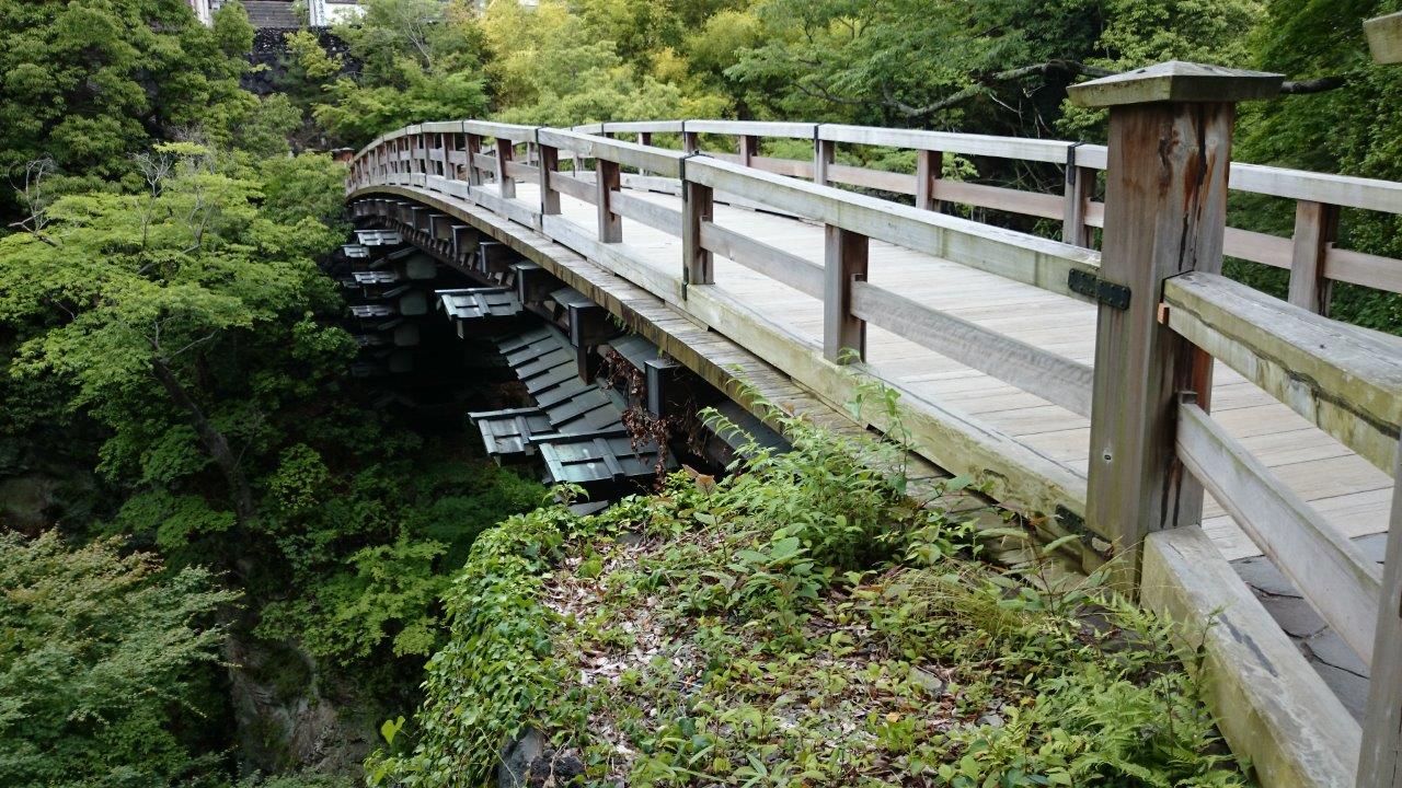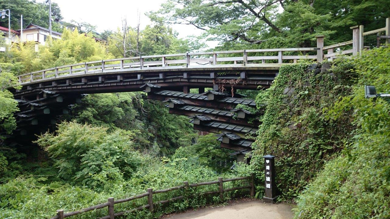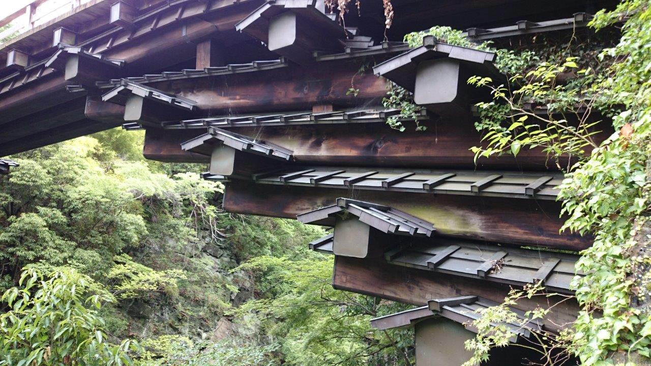 長さ30.9m、幅3.3m、高さ31mのその姿は、橋脚を全く使わない特殊なもので、鋭くそびえたつ両岸から張り出した四層のはねぎによって支えられています。