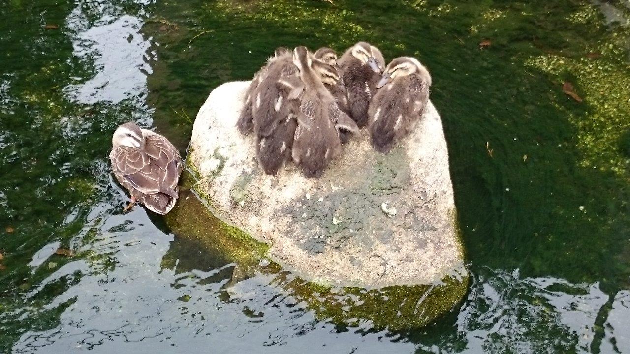 見学を終えて駅まで戻りかえりましたが、家に帰る途中近くの遊歩道を歩きました。ハンゲショウもお化粧が進みましたね。カルガモの子も大きくなりました。遊びつかれたのでしょうか親子で休憩中でした。