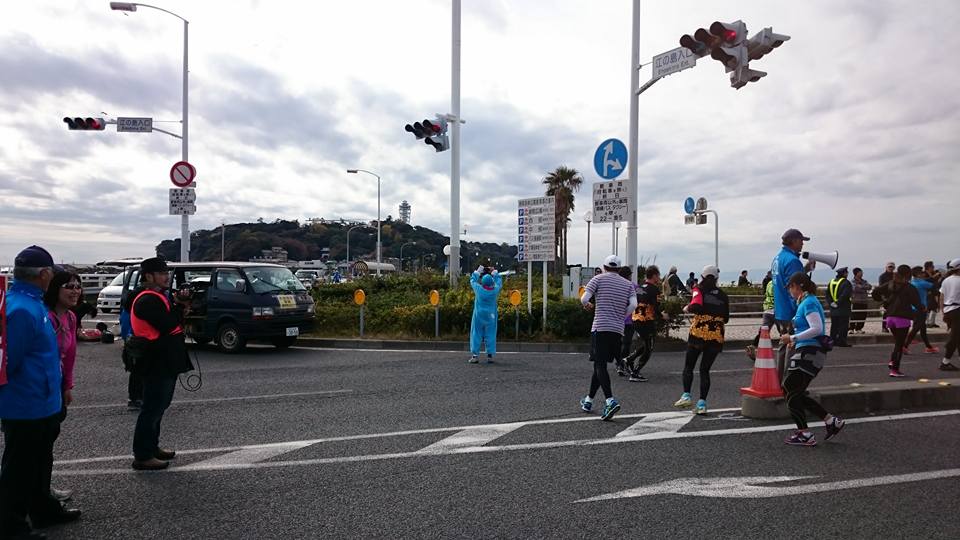 13Km付近で私の名前を呼ぶ声が!出場しないラン仲間が忙しい仕事を抜けて応援に駆けつけてくれました。元気が出ますね。折り返しの江ノ島までは快調の走りでしたが2Kmあたりから腰に疲労感がでてきてペースが遅くなって来ました。さらに35kmの関門では5分前に何とか通過して歩いたり走ったりの状態です。