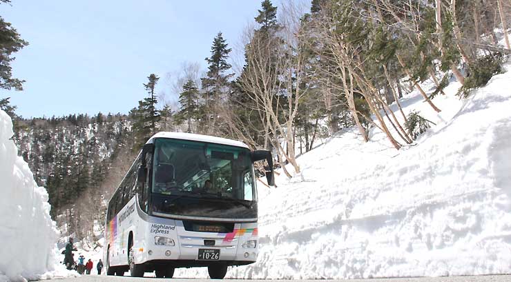 長野県道乗鞍岳線の「春山バス」4月23日から運行されたようだが当面は除雪が終わった標高約2350の位ケ原山荘まで1日4便を運行し、5月中旬〜下旬には標高約2600の大雪渓肩の小屋口まで運行区間を延ばすそうだ。6月末まで約2カ月間運行される。(写真は20日の試運転)