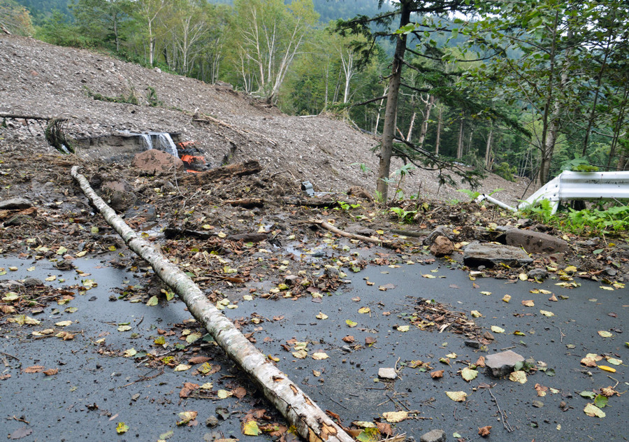 津別峠山頂から弟子屈側へ下ること約2.5km長さ1.6km、幅50mにわたって土石流が道道に爪痕を残している。カーブが連なる道路の2カ所が土砂に覆われ、ガードレールや標識は根元から折れて埋まい、山肌は削られ、木々は跡形もなく消失し、湧水が沢のように流れ落ち、一歩足を踏み入れると、土砂は柔らかく、再び大雨に見舞われれば、さらなる崩落は避けられそうにないようだ。
