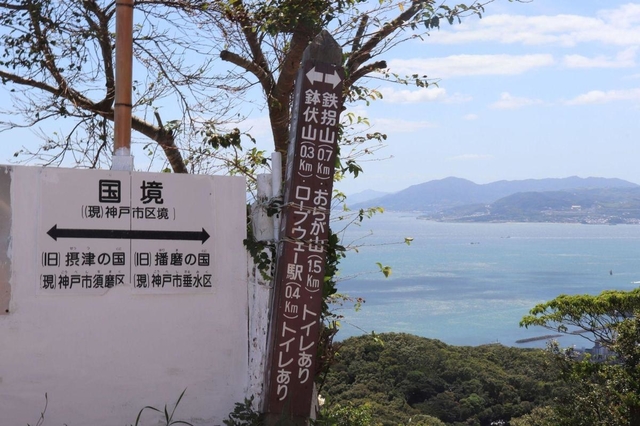 摂津、播磨、但馬、丹波、淡路の旧五国からなる兵庫県の「摂津」と「播磨」の国境を示す看板が、神戸市垂水区と須磨区の区境にそびえる旗振山(標高約253m)山頂にあるのをご存じでしょうか。垂水区役所発行の「垂水郷土史」には、豊臣秀吉が全国の土地で行った測量「太閤検地」により、摂津と播磨の国境が決定されたと記載されているようです。