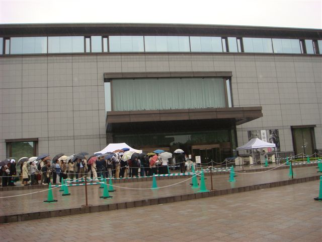 雨が上がったせいかまたまたなが~~い行列である。最後尾のプラカードは(写真クリックして待ち時間を確認してください)です。まだまだ続々と駅からやってきている。早く来てよかった。ちなみにすでに昨日までで入場者70万人を突破したそうだ。