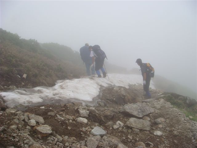 下山して雨具を着てザックを背負って次の目的地鏡平山荘目指してお出かけです。尾根は風も強くあめも横殴り。折戸岳分岐まで来ると雨はやみガスだけとなり楽になった。ちちぶ平の残雪は多くロープを伝わってのくだりとなる。軽アイゼンを着け滑らないように下った。ちちぶ平を過ぎ4箇所くらい残雪をトラバースしているうちに薄日も出だし歩いていると熱くなったのでアイゼンをはずし雨具を脱いだ。