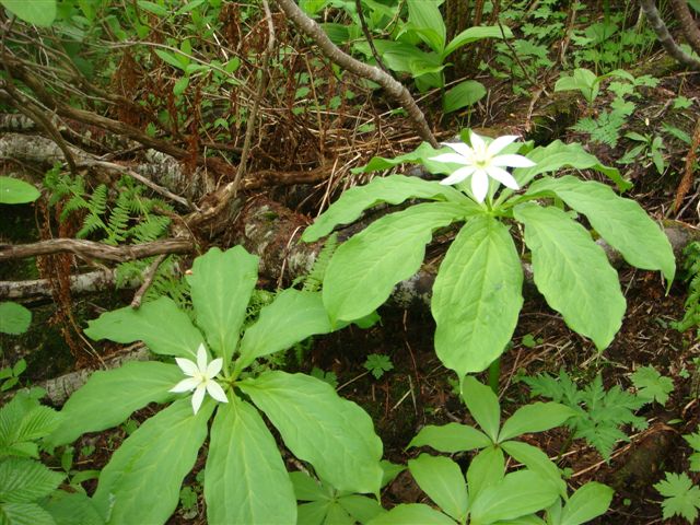 尾根にはミツバオウレン、ダイモンジソウ、キヌガサソウなど始めてみる花が咲き誇っていた。やはり梅雨明けのこの時期は雪解けが進んできて高山植物がいっせいに咲き出していた。