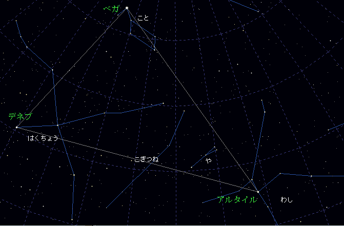 0777今日は七夕で小暑。七夕飾りを見に行くのも良いが織姫と彦星を探すのはどうだろう。以前、山友で星座に詳しい人がいて満点の星の夜空を仰いで説明を受けたものだ。今は実家に帰ってしまい機会がなくなった。夏の大三角形を見つければ織姫と彦星は簡単に見つけられる。こと座の1等星ベガが織姫、わし座の1等星アルタイルが彦星。そして白鳥座の頭の星がデネブでこの3つの星が大三角形にあたる。詳しくは下記URLを参照のこと。