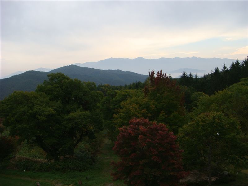 御嶽山登山後おんたけ休暇村で一泊し翌日帰途に着いたが、奈良井宿によって帰ることにした。朝は宿から中央アルプスの山並みが見えた。