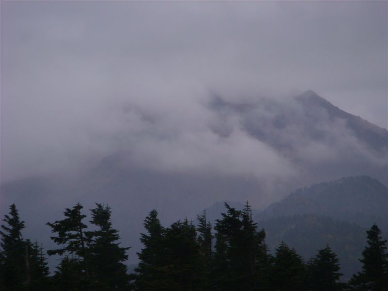 新穂高ロープウェイに到着し霧雨の中、乗車し西穂高口駅に向います。視界超悪し。